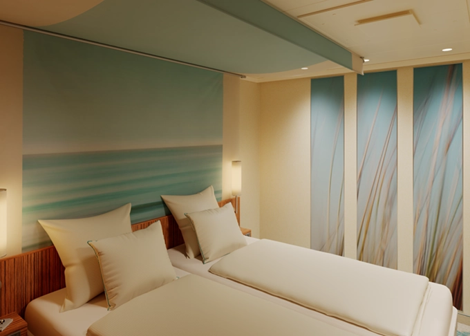 CA - Vonkajšia kajuta PREMIUM / obmedzený výhľad 14-16,5 m². Neotvárateľné okno / obmedzený výhľad. 6. paluba. Max 2 osoby. Cenový model Premium. 4 740 € 2 370 € za osobu