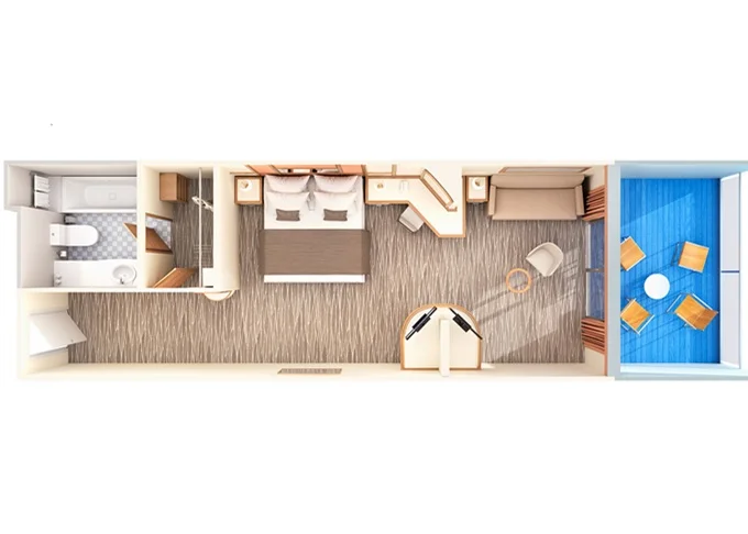 | 8B - Kajuta s balkónom 21,5 - 25,5 m² (vrátane balkóna). 10. paluba stred, vzadu; 11. paluba vpredu, vzadu. | 3 804 € 1 902 € za osobu | ||