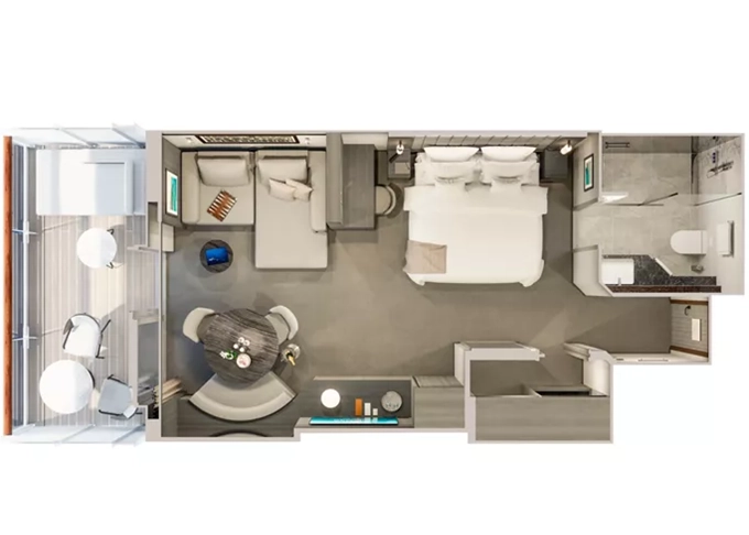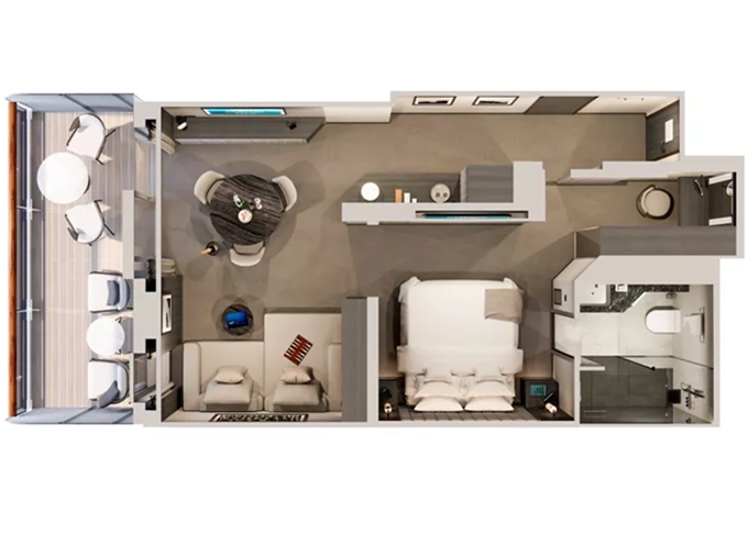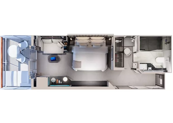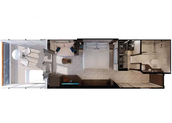 Ocean Residence - Cove Residence Suita + terasa so sedením a lehátkami 56 m². Spálňa s obývacou a jedálenskou časťou, šatník. Koktailová súprava, minibar, kávovar, vodná kanvica, ďalekohľad, sejf, kúpeľňa so sprchou. Závesy, svetlo, klimatizácia ovládané smart technológiou. Taška Technogym Case Kit. Fľaša šampanského na privítanie. Maximálna kapacita 3 osoby. 14 961 € 4 987 € za osobu