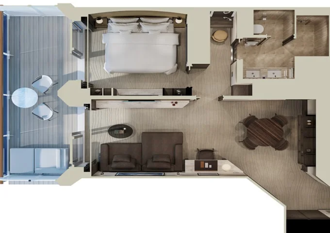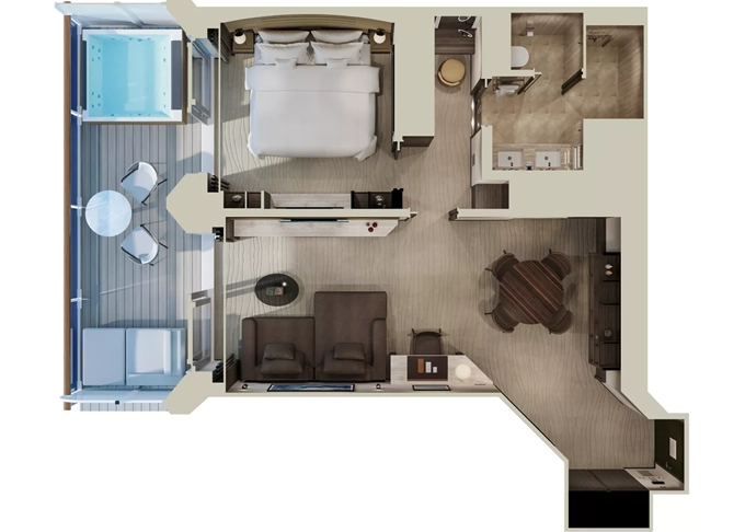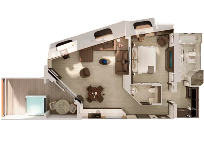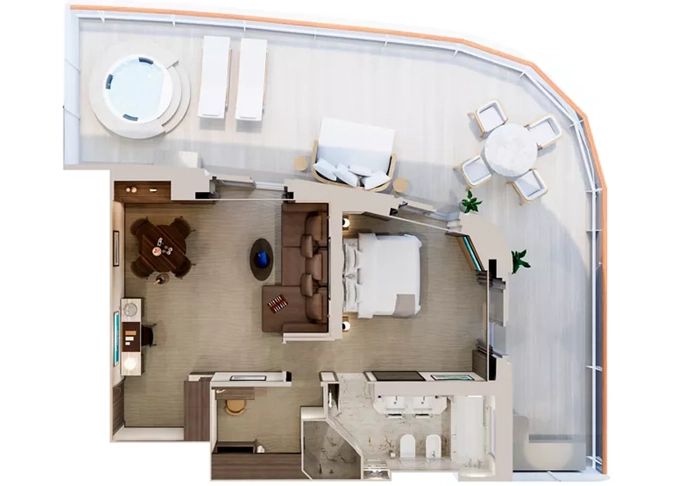 Ocean Residence - Cove Residence s vírivkou Suita + terasa s vírivkou a lehátkami 56 m². Spálňa s obývacou a jedálenskou časťou, šatník. Koktailová súprava, minibar, kávovar, vodná kanvica, ďalekohľad, sejf, kúpeľňa so sprchou. Závesy, svetlo, klimatizácia ovládané smart technológiou. Taška Technogym Case Kit. Fľaša šampanského na privítanie. Maximálna kapacita 3 osoby. 26 920 € 6 730 € za osobu