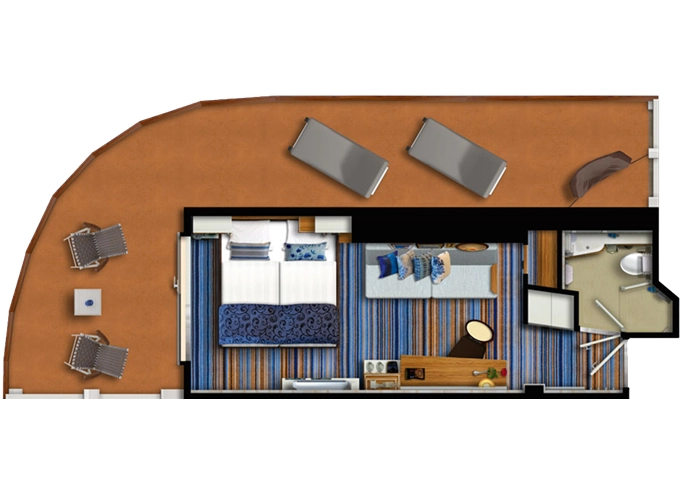 | JKAO - Junior Suite s balkónom 26 m² + balkón 7 m² so stolom. . paluba. Max 4 osoby. Výhody Junior Suite. | 14 788 € 3 697 € za osobu | ||