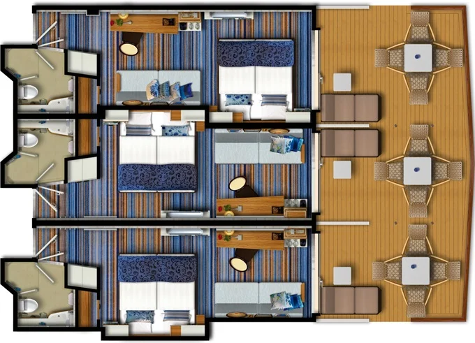 | VEPO - Kajuta s terasou Premium 17 m² + balkón 30 m² s 2 kreslami, 2 ležadlami a hojdacou sieťou. 7-11. paluba. Max 3 osoby. | 12 648 € 4 216 € za osobu |